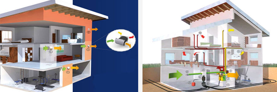 مطابق با تصاویر بالا، سیستمهای تهویه با امکان بازیابی حرارتی به دو صورت مرکزی و مجزا قابل ارائه است. در سیستمهای مجزا برای هر منطقه تجهیز جداگانه باید در نظر گرفته شود که در مقابل دیگر نیازی به زیرساخت و سیستم توزیع هوا ندارد. در سیستمهای مرکزی نیز مطابق با وسعت فضا، ظرفیت دستگاه مرکزی تعیین میگردد. این سیستم با سه نوع لولههای انعطافپذیر، لولههای عایق حرارتی و لولههای مسطح و باریک برای فضاهای کوچک، قابل ارائه است.