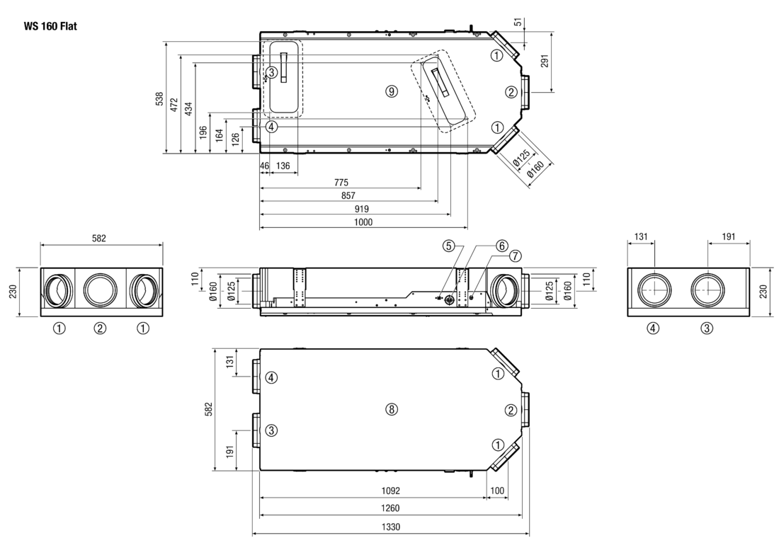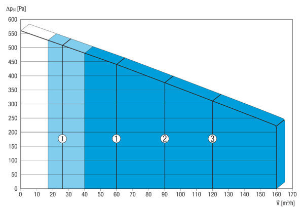 حجم هوای این دستگاه 40 تا 160 مترمکعب در ساعت و سایز دریچهها 125 میلیمتر است. این دستگاه دارای دو دریچه تأمین هوا در سمت چپ و راست و یک دریچه خروجی در مرکز است. برای اتصال به کانالهای خرطومی از سوکتهای SVR 125 یا خمهای 90 درجه 90 - 125 میتوان استفاده کرد.