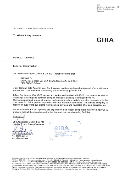 از آنجایی که شرکت GIRA ضامن اجرایی تمامی پروژههای نمایندهگان انحصاری خود بوده و رزومه آنها را رزومه خود میداند، داشتن مدارک معتبر KNX/EIB را جهت اجازه فروش محصولات هوشمند خود قید نموده و جهت اطمینان بیشتر، خود نیز با اجرای سمینارهای آموزشی علمی و عملی، کار را محکم مینماید.